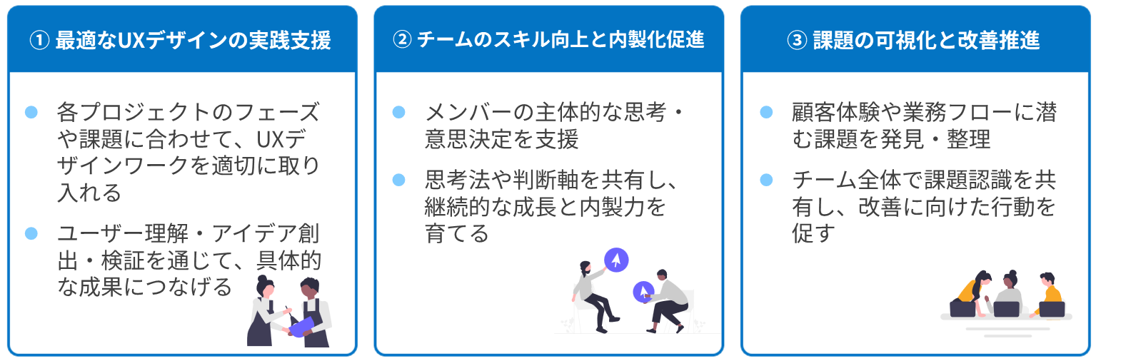 UX専門家がチームの状況に応じて、UXプロセスを円滑に進められるようサポートすることで、プロダクト価値の向上に貢献し、UXデザインを実践できる力の定着を目指します。